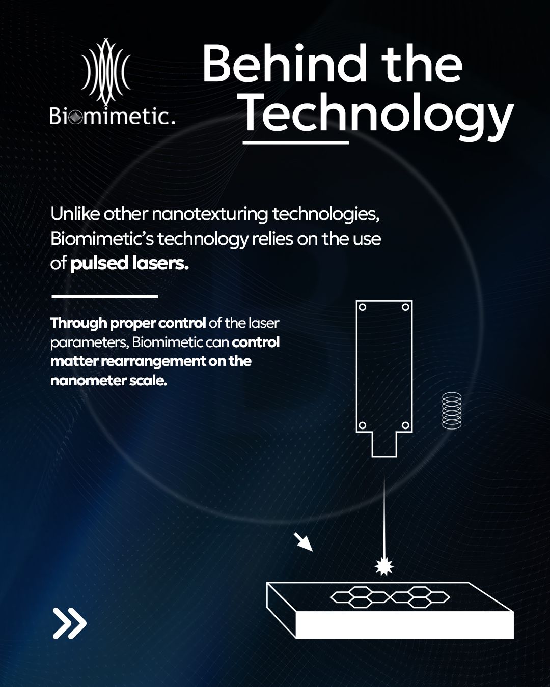Unlike conventional nanostructuring techniques that depend on chemicals, consumables, and multi-step processes, Biomimetic’s patented technology harnesses the power of pulsed lasers to create highly functional surfaces — cleanly, efficiently, and repeatably.